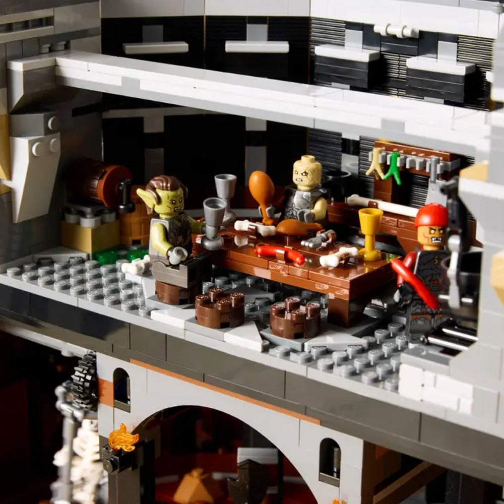 - Características y funciones: La puerta negra está automatizada, el Ojo de Sauron se ilumina y la estructura modular de 4 secciones cuenta con detallados espacios, como una forja de armas, una sala del trono y una prisión