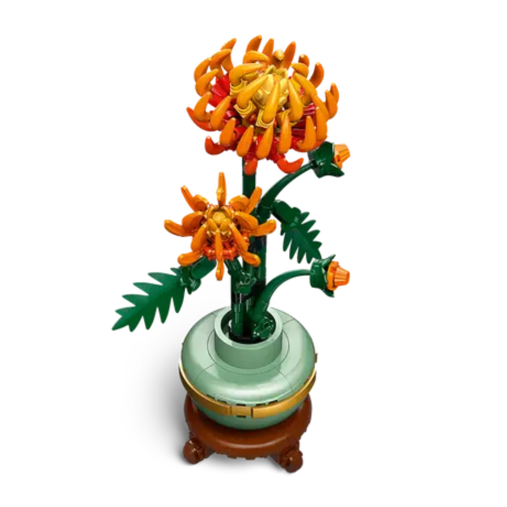 - Contenido de la caja: Este set de construcción creativa incluye todo lo que necesitas para ensamblar un crisantemo, además de una maceta verde pastel con una banda dorada y una peana que imita la madera
