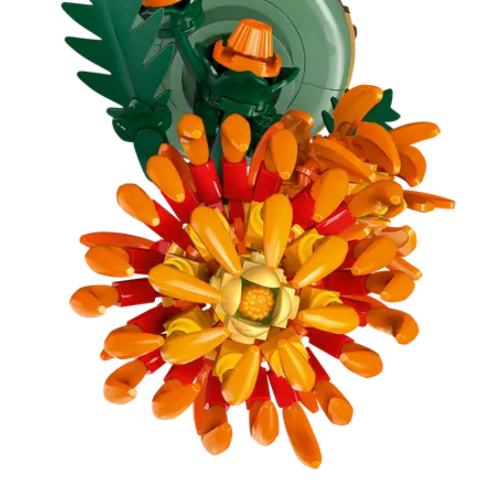 - Capullos en floración: El set LEGO® Icons Crisantemo, con hojas y pétalos articulados, incluye vivas flores naranjas en distintas etapas de floración (1 abierta, 1 abriéndose y 2 aún en capullo)