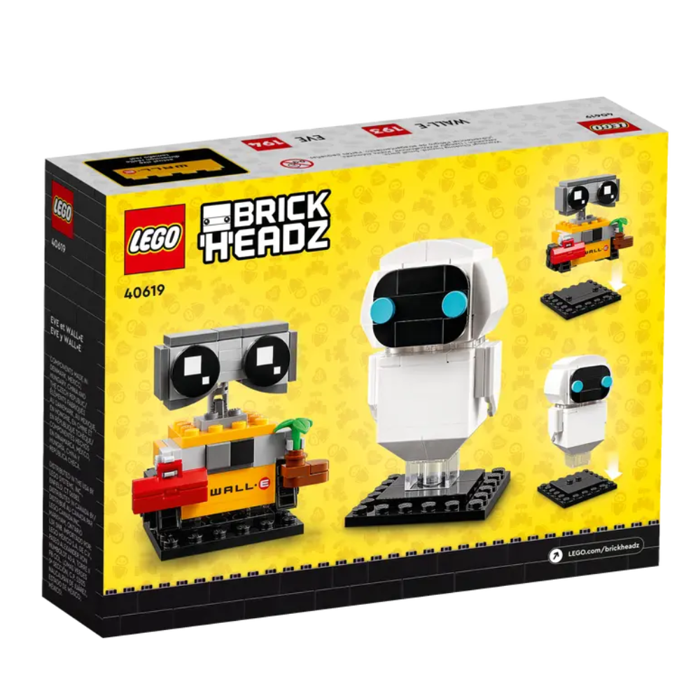 - Divertidos personajes robóticos: Figuras LEGO® BrickHeadz™ construibles para exponer de los personajes Disney•Pixar EVA y WALL•E (40619). Un regalo creativo para fans de la película o niños y niñas mayores con pasión por los robots