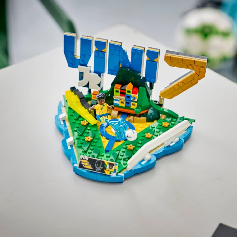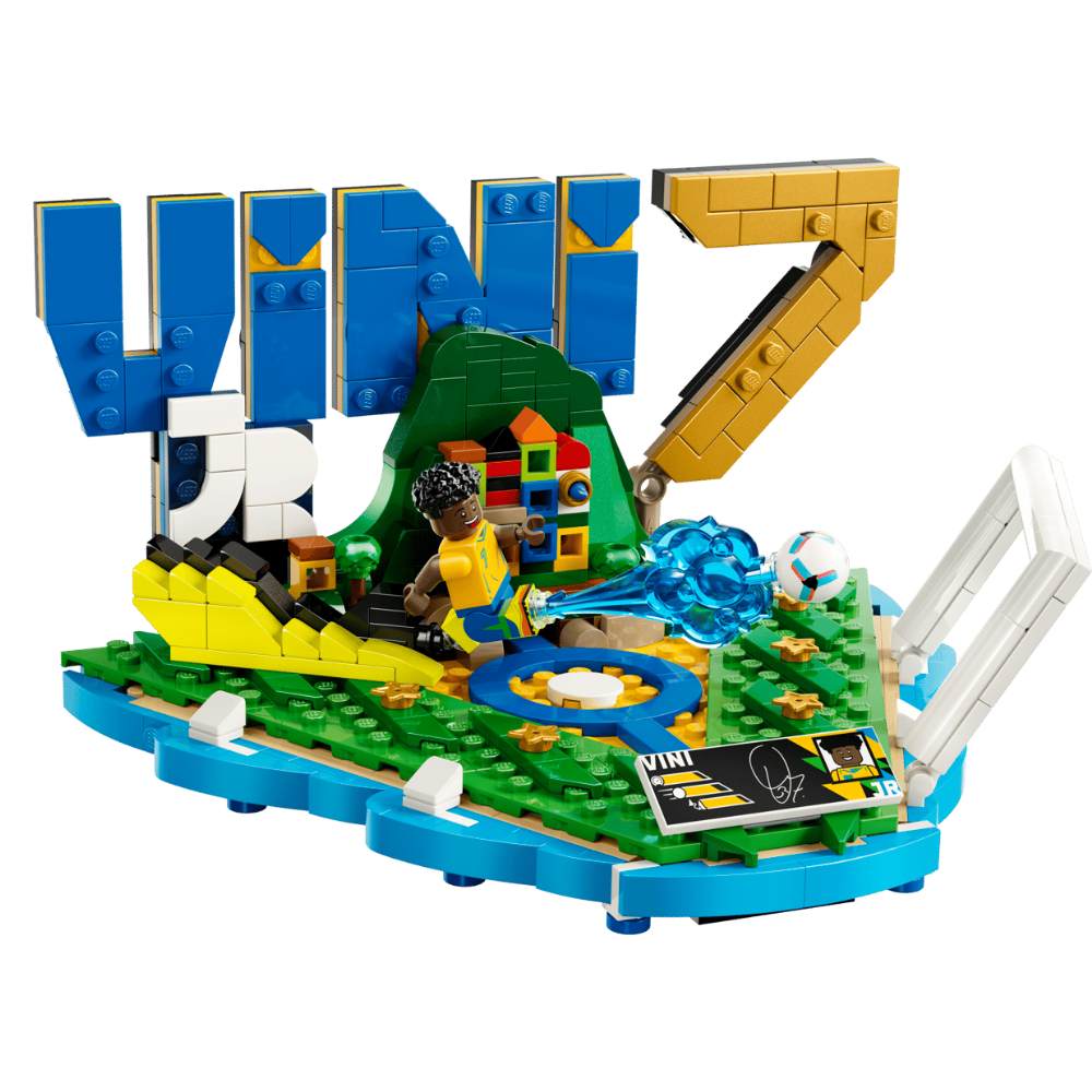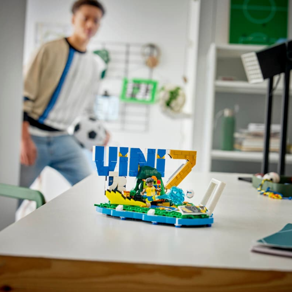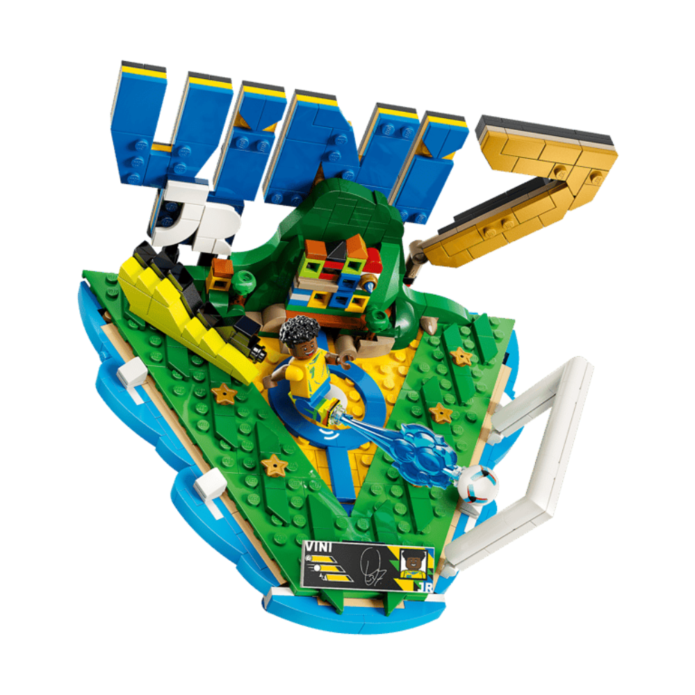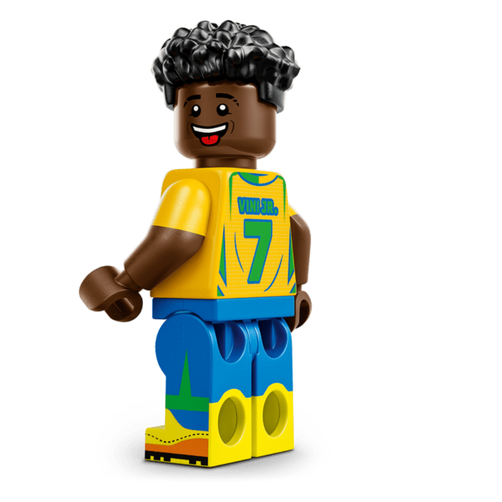 - MINIFIGURA LEGO® DEL JUGADOR DE FÚTBOL: Una minifigura de Vini Jr. da vida al set dedicado al futbolista, que aparece representado en su característica pose de remate a gol