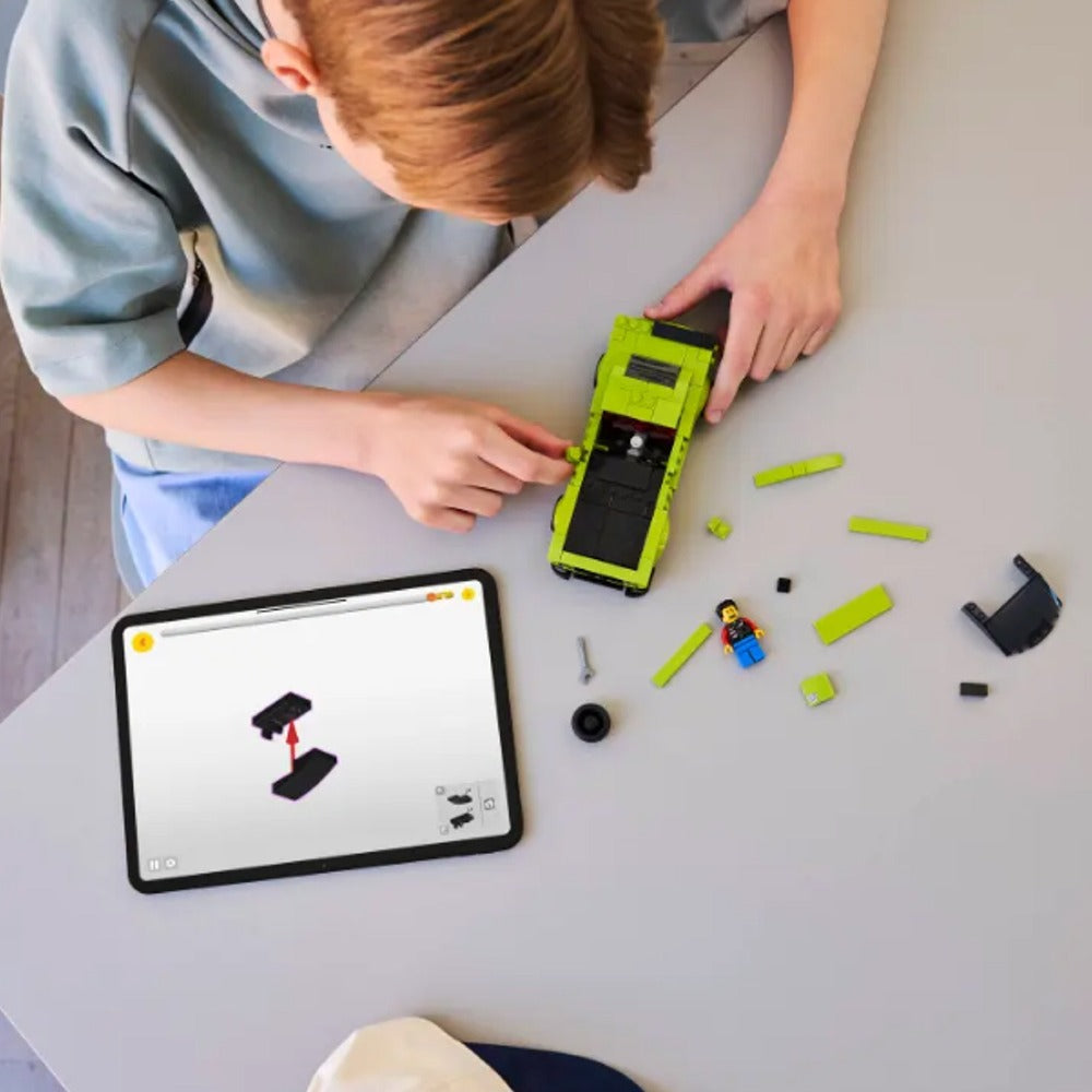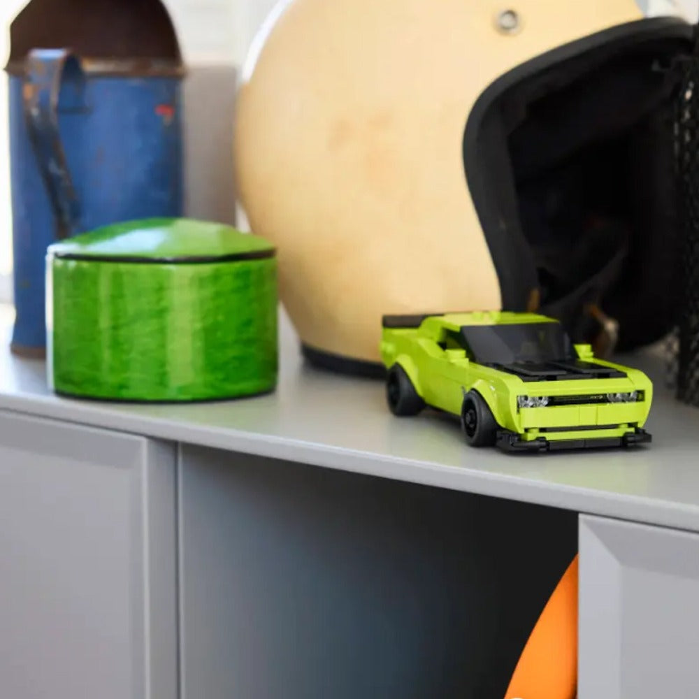 - Maqueta de exposición de un Dodge Hellcat: Después de que los peques hayan disfrutado interpretando historias de carreras con la réplica del coche construida con ladrillos, pueden exponerla en un estante o un escritorio
