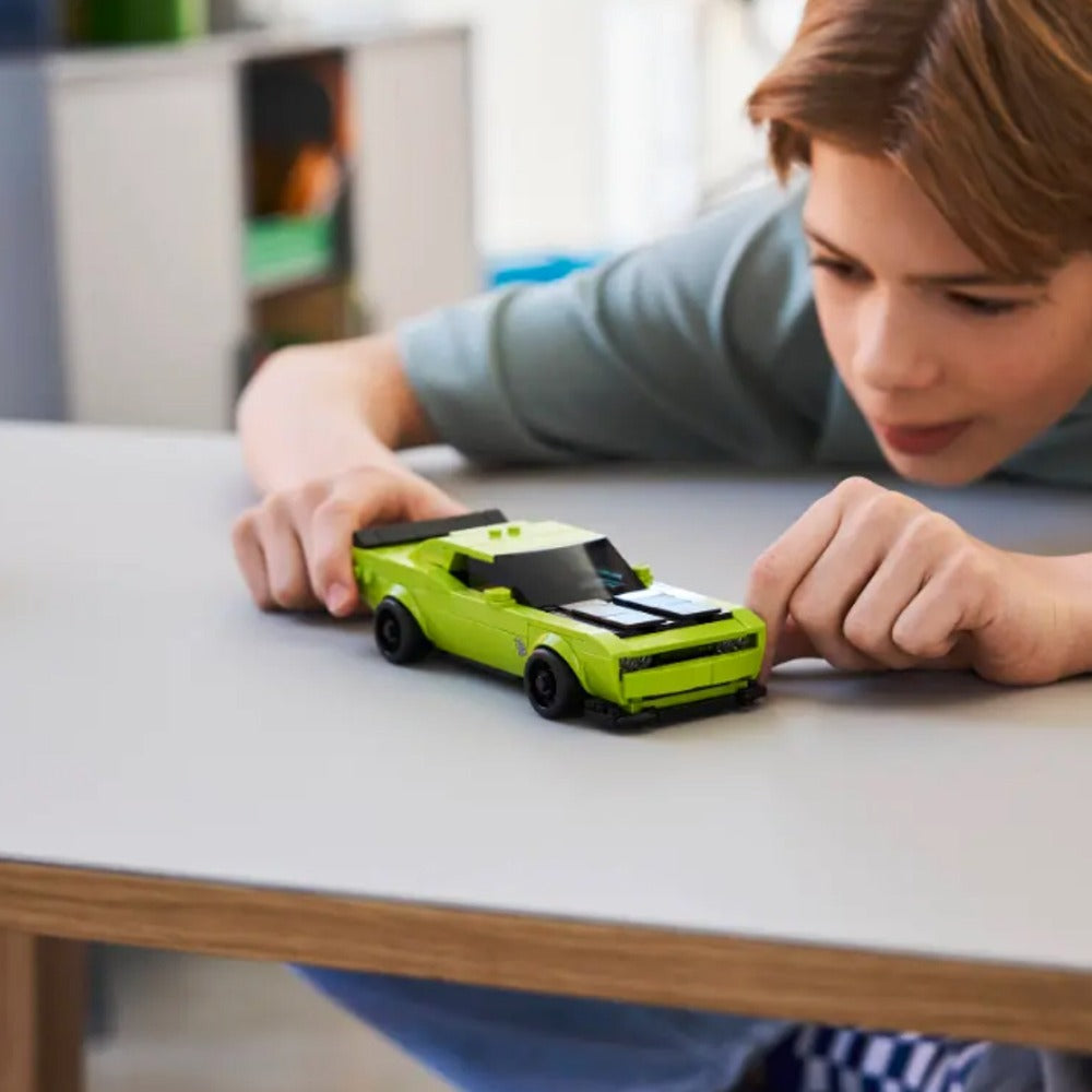 - Un potente deportivo de juguete para peques: Los niños y las niñas a partir de 9 años o los apasionados de los deportivos clásicos pueden construir, exponer y jugar a conducir el juguete LEGO® Speed Champions Deportivo Dodge Challenger SRT Hellcat