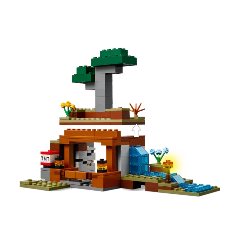 - Set basado en el videojuego: La acción tiene lugar en el bioma Sabana del juego, donde hay una mina con una función de dinamita controlada por palanca que hace saltar por los aires una parte del terreno para dejar al descubierto el mineral precioso