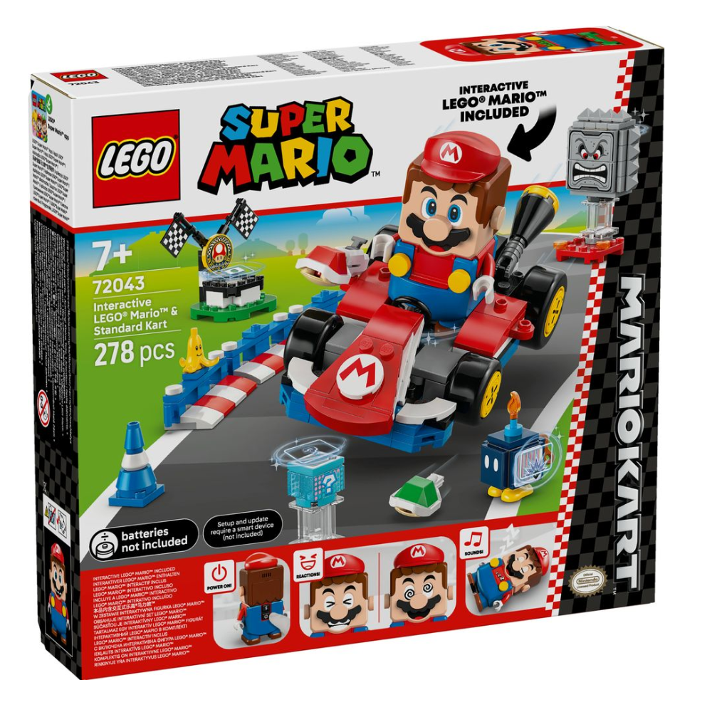 - Juguete interactivo: Corre con LEGO® Mario™ en el Kart estándar, gana recompensas digitales de la caja de objetos, derrota al Bob-omb y el Roca Picuda, mira cómo reacciona LEGO Mario a las placas LEGO verde y roja, y más