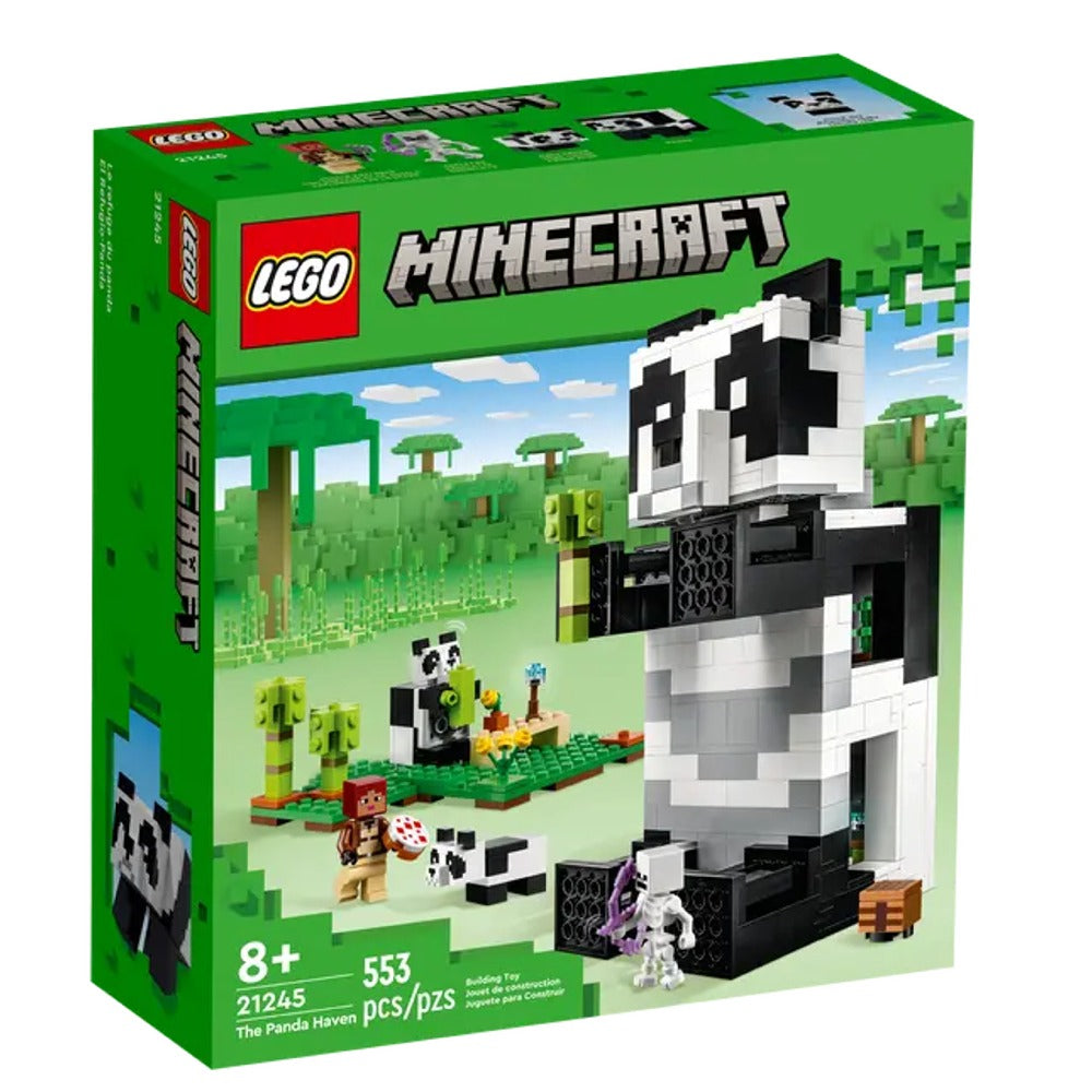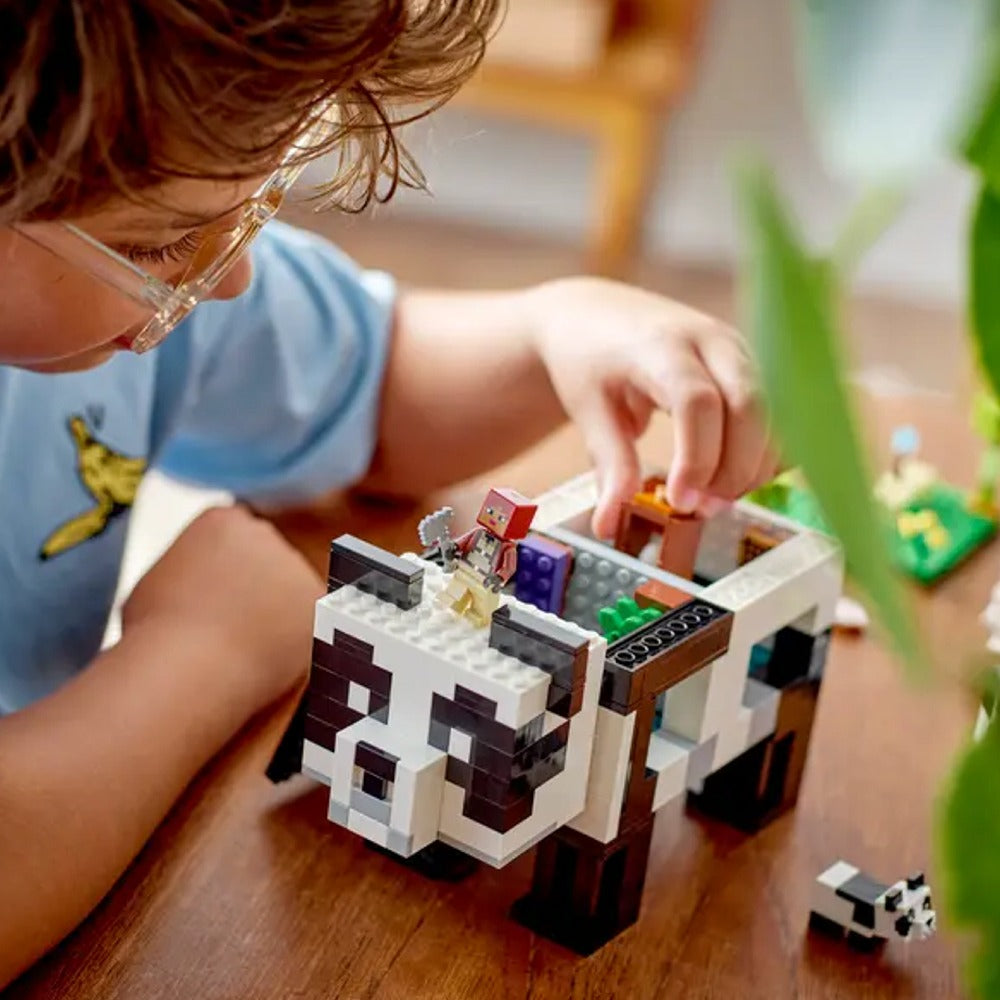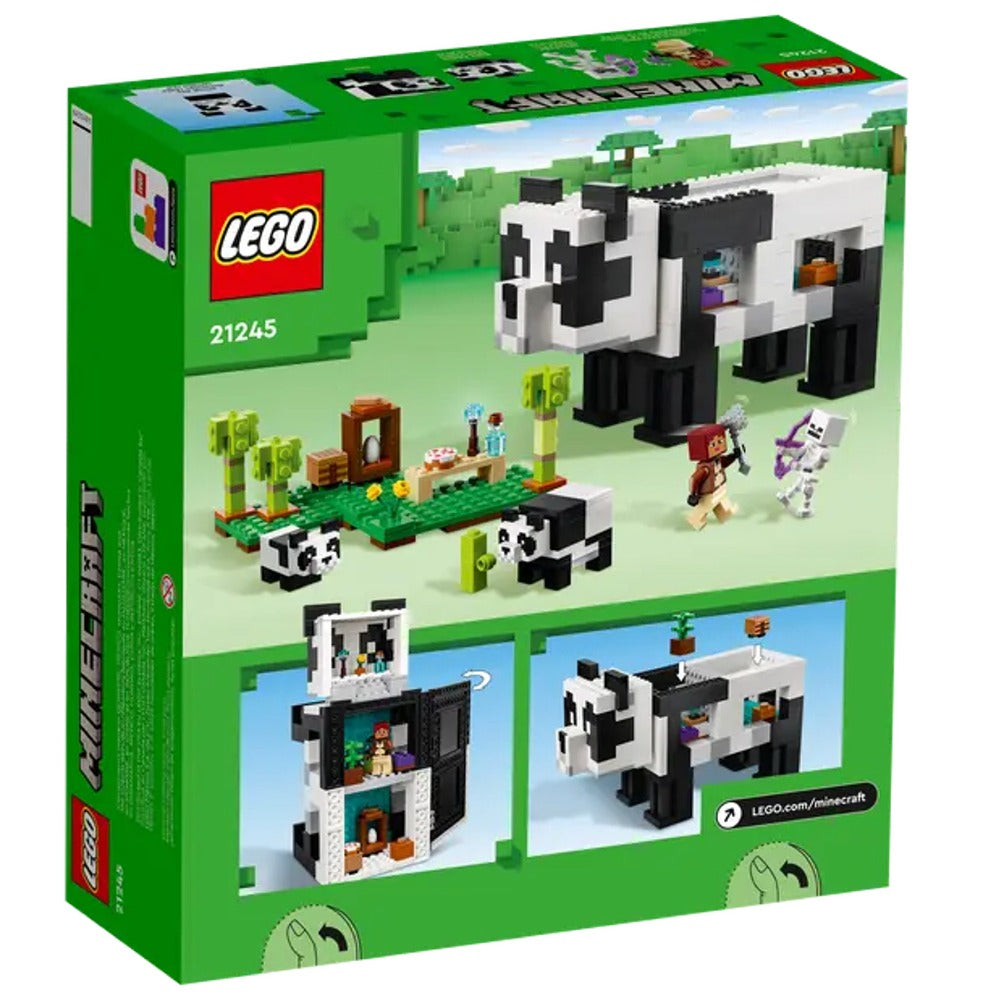 - Set con una casa-panda: El set LEGO® Minecraft® El Refugio-Panda (21245) consiste en una casa construible de 3 plantas con forma de panda que tiene habitaciones y extremidades articuladas para poder mover el modelo como si fuera un panda