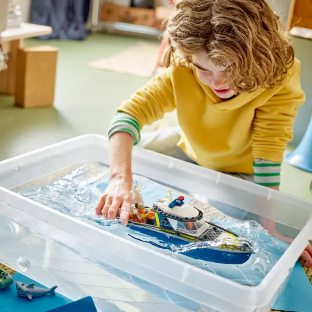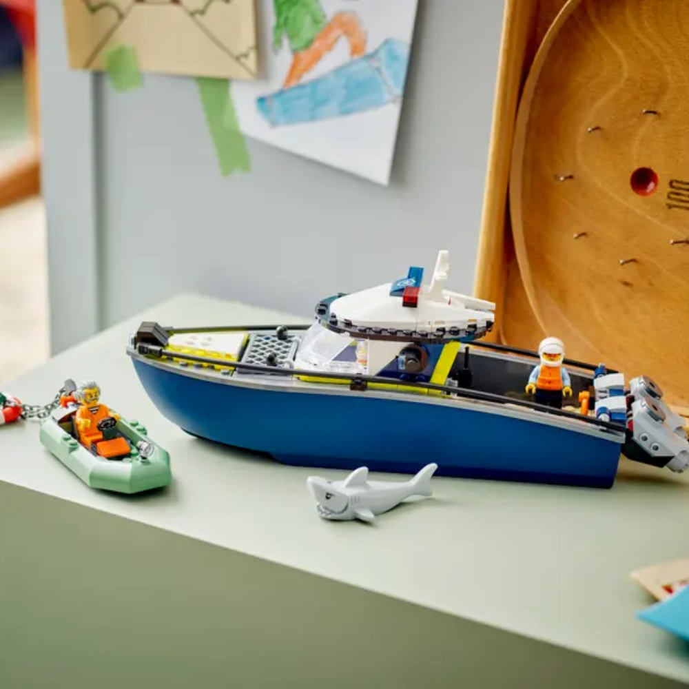- Juego basado en una persecución en barco de policía para héroes cotidianos: Los niños podrán sumergirse en un océano de trepidantes aventuras de policías y ladrones con el set LEGO® City Persecución en Barco de Policía para mayores de 6 años