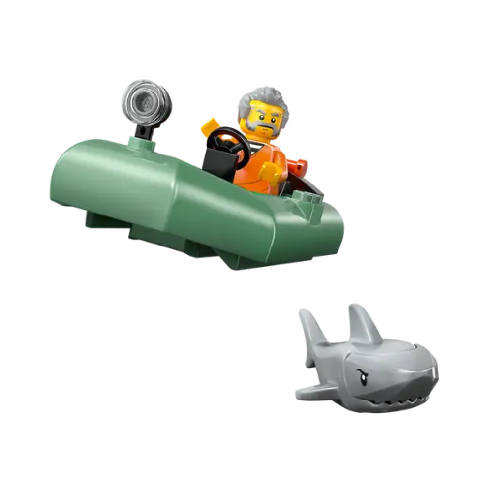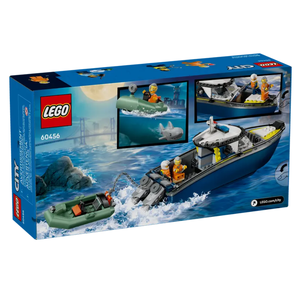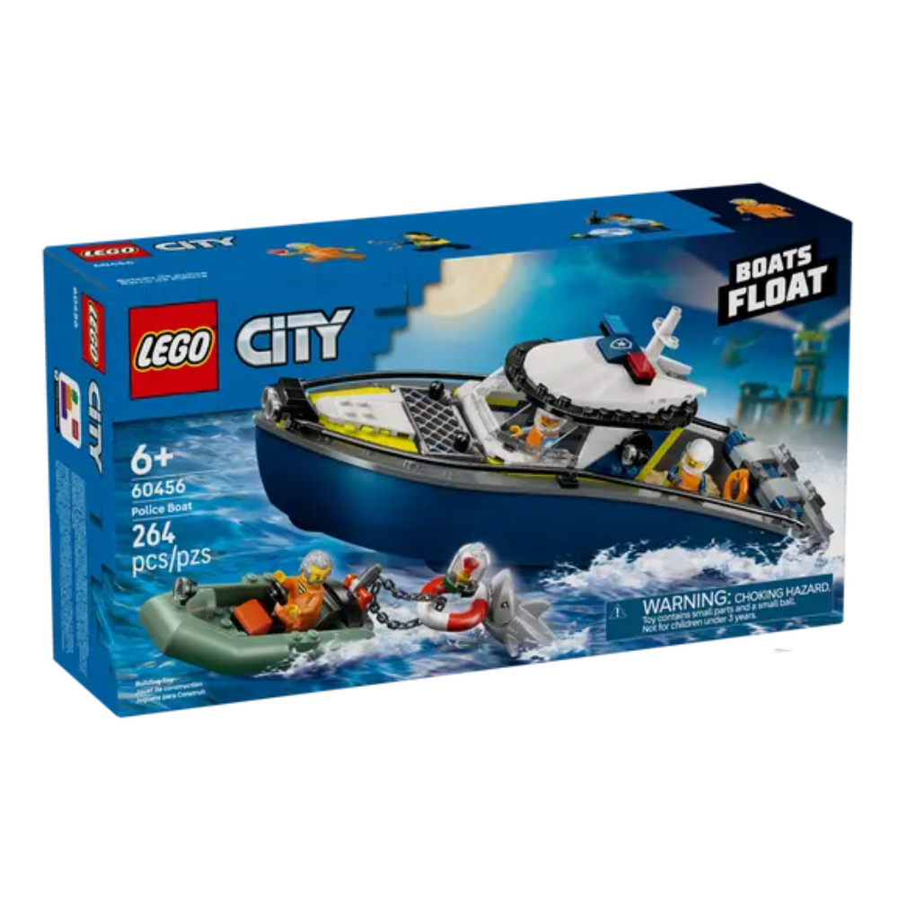 - ¿Qué contiene la caja? Todo lo necesario para que los peques construyan un barco de policía de juguete y el potente bote neumático de un ladrón, además de 2 minifiguras de agentes de policía, una minifigura de un ladrón y una figura de un tiburón