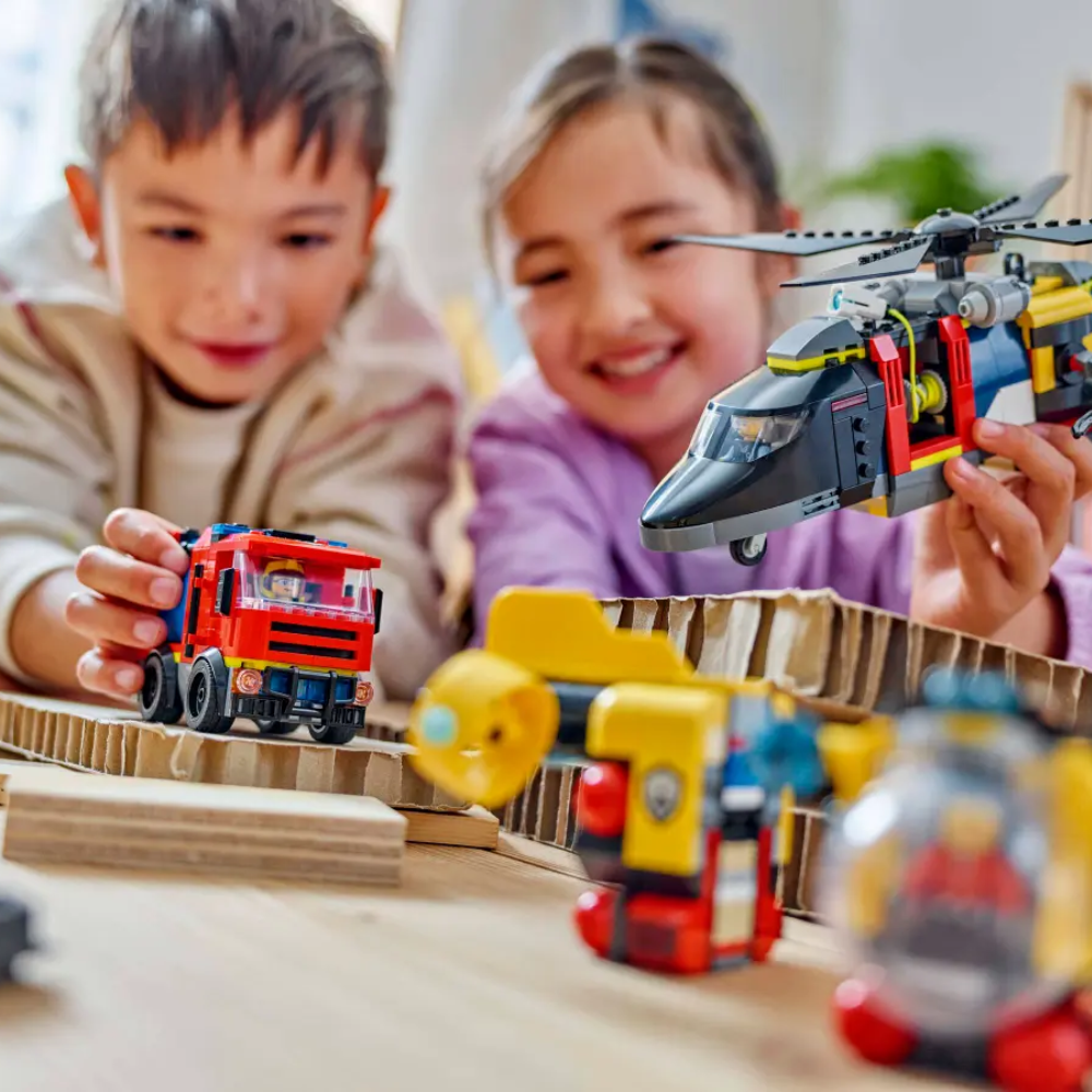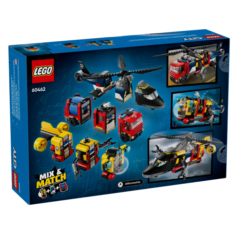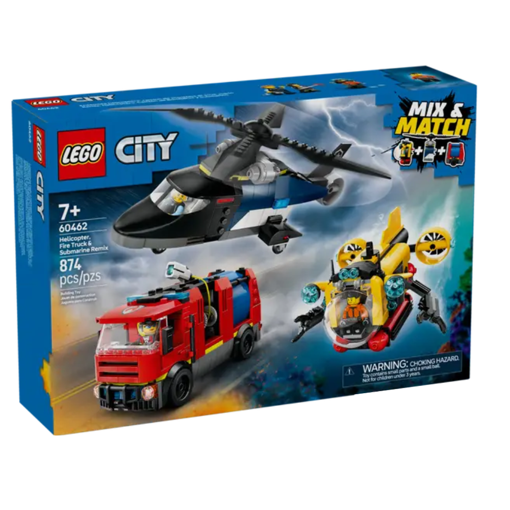 - Set de construcción con camión de bomberos, helicóptero y submarino de juguete: Triplica las emociones con el set LEGO® City Remix: Helicóptero, Camión de Bomberos y Submarino para niños y niñas de 7 años o más que disfrutan construyendo y creando