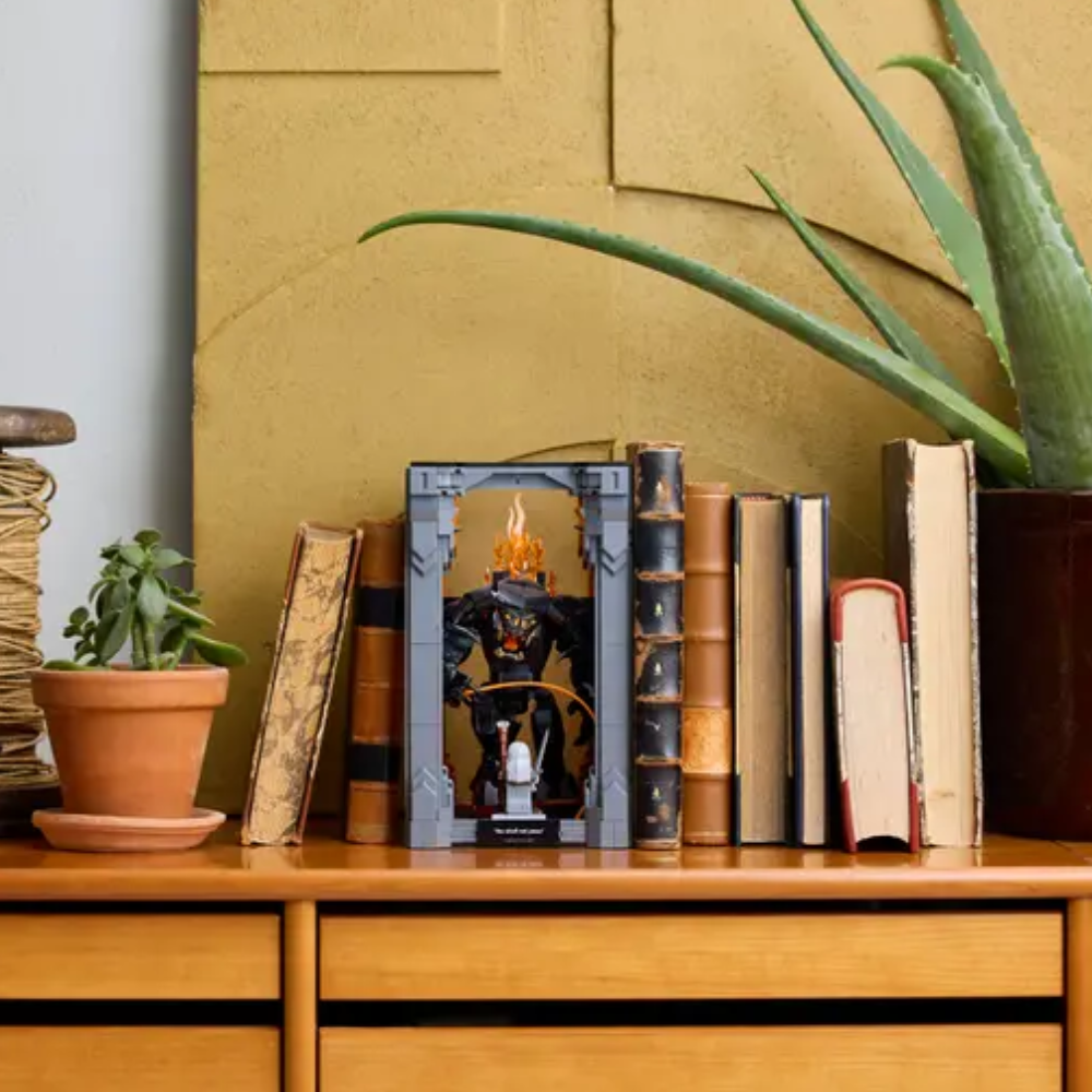 - Kit de construcción de un evocador rincón entre libros muy cinematográfico: Crea una ventana con vistas a la Tierra Media con el set de construcción para adultos LEGO® Icons Rincón entre Libros: El Señor de los Anillos: Balrog™