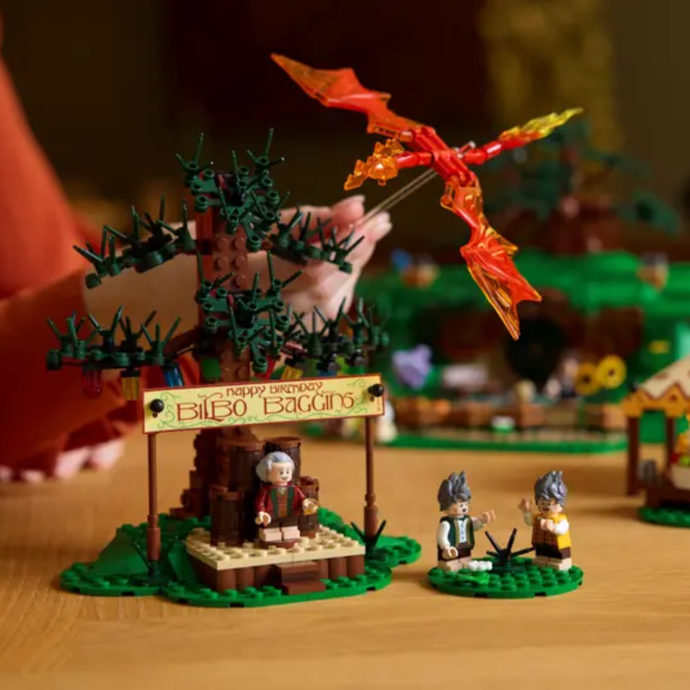 - Infinidad de detalles inspirados en las películas: Cuenta con el carro de Gandalf, fuegos artificiales, una figura del dragón de fuegos artificiales, el árbol de la fiesta, una carpa y el libro de Bilbo, que se puede exponer abierto o cerrado